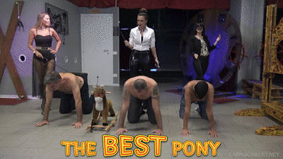 Mistresses Scarlet, Cleo, and Gabriella were having a triple date with their boyfriends, and everything was going so well for them that they decided to have more fun after having drinks. They were talking about racing, and they got this idea of riding on the men's backs, and they did, and they raced, and they had plenty of fun while at it, and they even made the guys lick their boots clean and whipped their ass